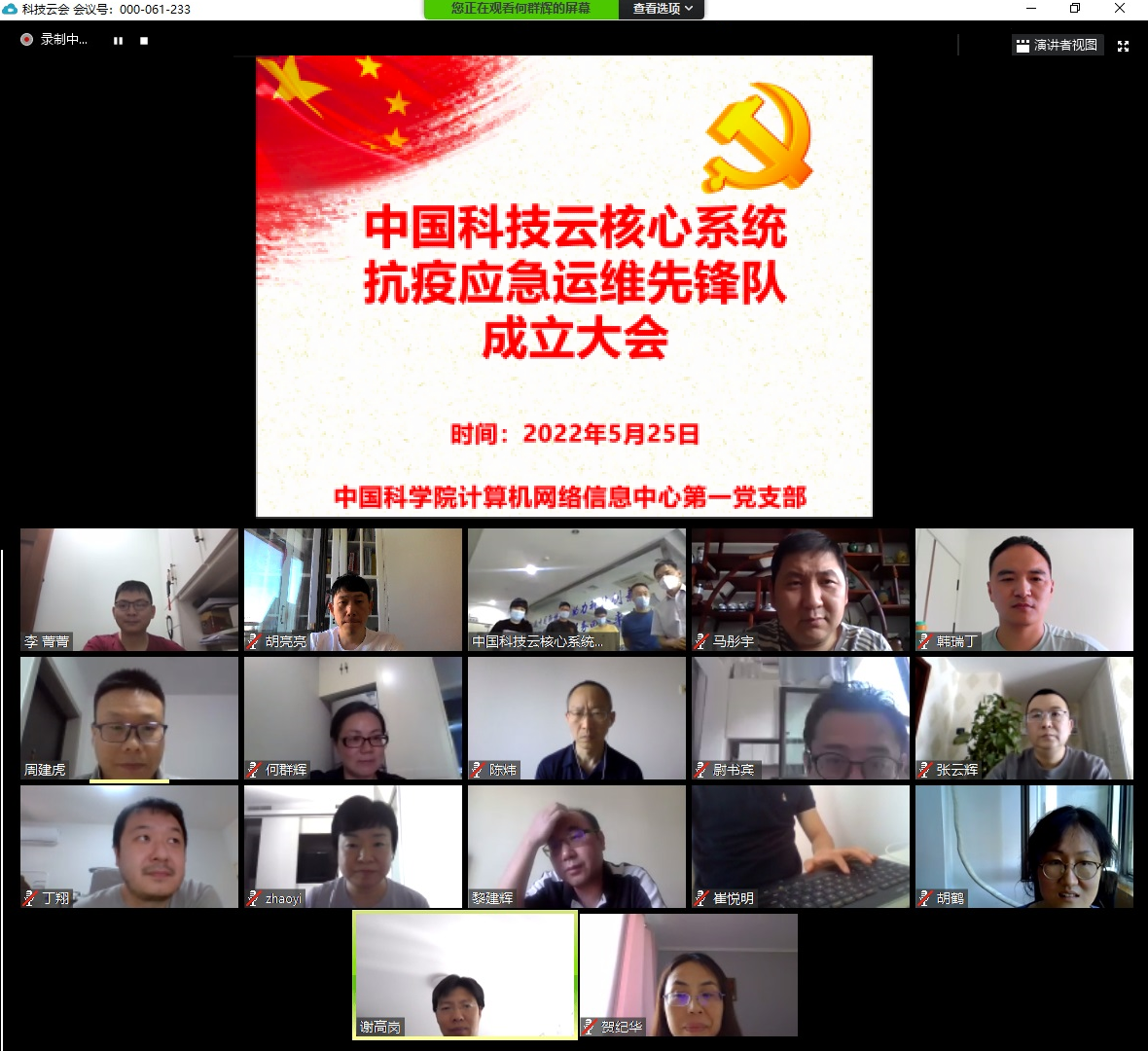對(duì)黨忠誠(chéng),始于足下!為了動(dòng)員和鼓舞抗疫應(yīng)急運(yùn)維一線(xiàn)的士氣,第一黨支部在5月25日通過(guò)科技云會(huì)舉行了“中國(guó)科技云核心系統(tǒng)抗疫應(yīng)急運(yùn)維先鋒隊(duì)成立大會(huì)”。