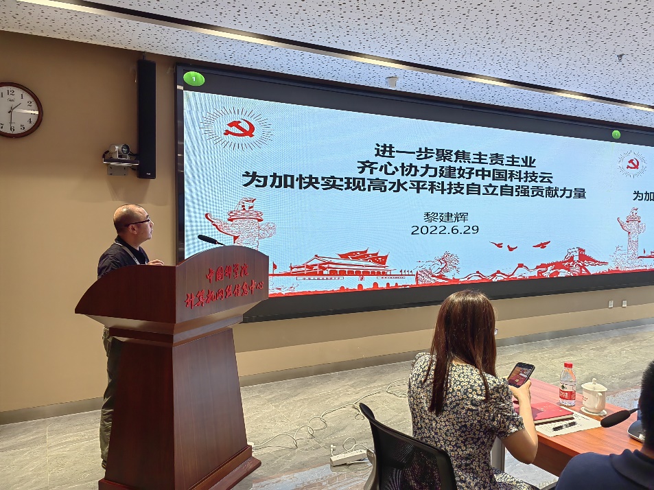 會議第一階段黎建輝以《進一步聚焦主責主業(yè)齊心協(xié)力建設(shè)好中國科技云為加快實現(xiàn)高水平科技自立自強貢獻力量》為題給支部全體黨員講了一次黨課,對“習近平關(guān)于網(wǎng)絡(luò)強國論述”和“習近平關(guān)于高水平科技自立自強論述”兩部分內(nèi)容做了深刻的剖析,圍繞科技云主責主業(yè),對新一代中國科技云發(fā)展方向做出了全面規(guī)劃。