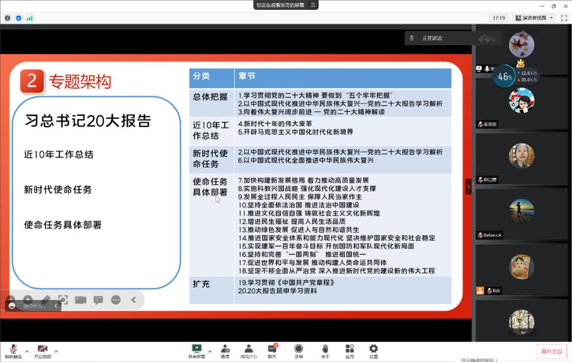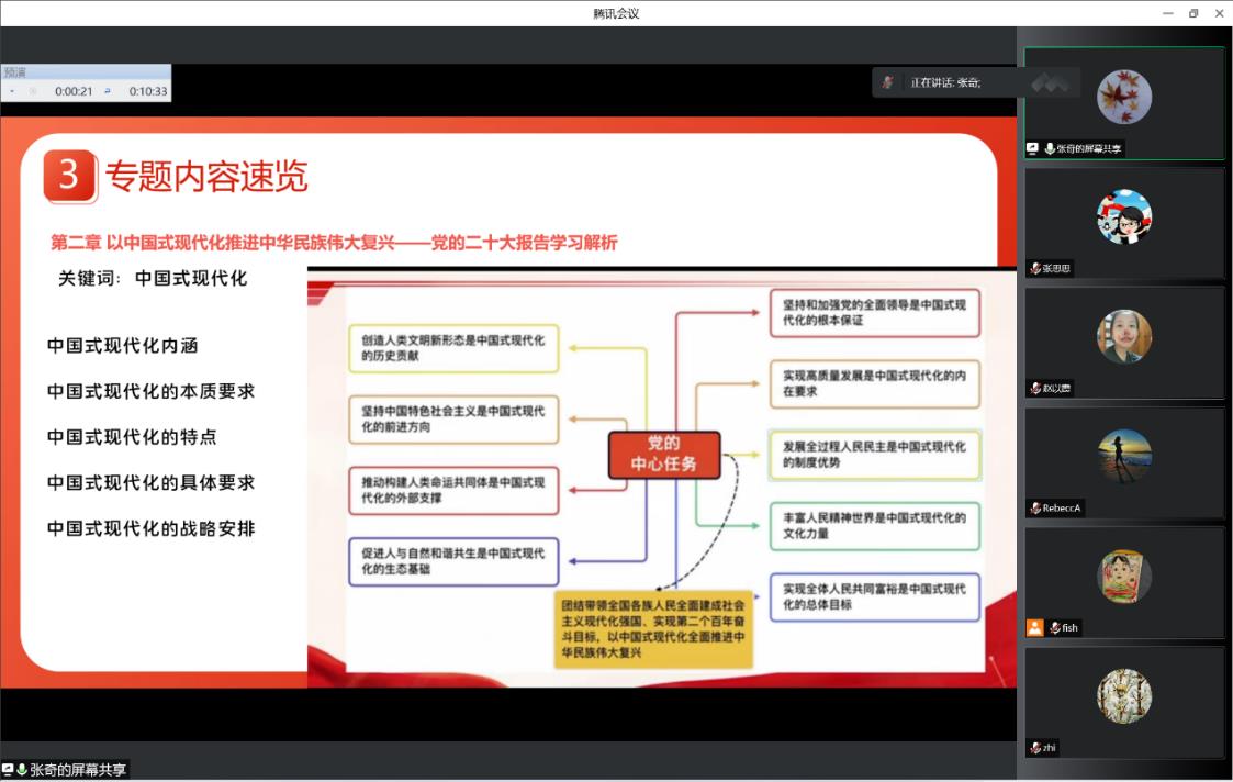 黨員張奇作為領(lǐng)學(xué)者詳細(xì)闡述如何通過院繼續(xù)教育網(wǎng)“學(xué)習(xí)貫徹黨的二十大精神”網(wǎng)上專題班更加系統(tǒng)全面地學(xué)習(xí)二十大報(bào)告。他指出整個專題架構(gòu)緊緊圍繞二十大報(bào)告,從近十年工作總結(jié)、新時代使命任務(wù)、使命任務(wù)具體部署三個方面做了深入細(xì)致的解讀,并對每一章節(jié)依次做了關(guān)鍵詞分析、重點(diǎn)解析,引導(dǎo)大家全面準(zhǔn)確地把握黨的二十大精神。