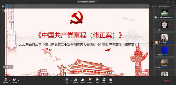 ????孫健英和金鐘分別對本次學(xué)習(xí)大會進(jìn)行了點(diǎn)評。孫健英認(rèn)為今天的活動很好的落實(shí)了黨中央、院黨委和中心黨委的要求,深入學(xué)習(xí)了二十大精神。學(xué)習(xí)內(nèi)容很切合實(shí)際。通過今天的交流學(xué)習(xí)凝聚了力量。孫健英傳達(dá)了院里關(guān)于學(xué)習(xí)二十大的要求,并強(qiáng)調(diào)在當(dāng)前疫情形勢下,支部要發(fā)揮政治堡壘、思政隊(duì)伍的作用,強(qiáng)化對員工和學(xué)生的思想引領(lǐng)。金鐘認(rèn)為通過本次學(xué)習(xí),對全面從嚴(yán)治黨的思想有了更全面的理解,對中心在軟硬件平臺和人才方面的規(guī)劃有了更深刻的認(rèn)識。通過二十大報(bào)告和黨章學(xué)習(xí)以及黨員分享,對二十大的精神有了更深層次的領(lǐng)會。當(dāng)前疫情形勢下,要發(fā)揮好支部戰(zhàn)斗堡壘作用,科學(xué)積極地認(rèn)識和對待疫情,同時(shí),我們科研工作者要以二十大精神為指引,努力做好本職科研工作。