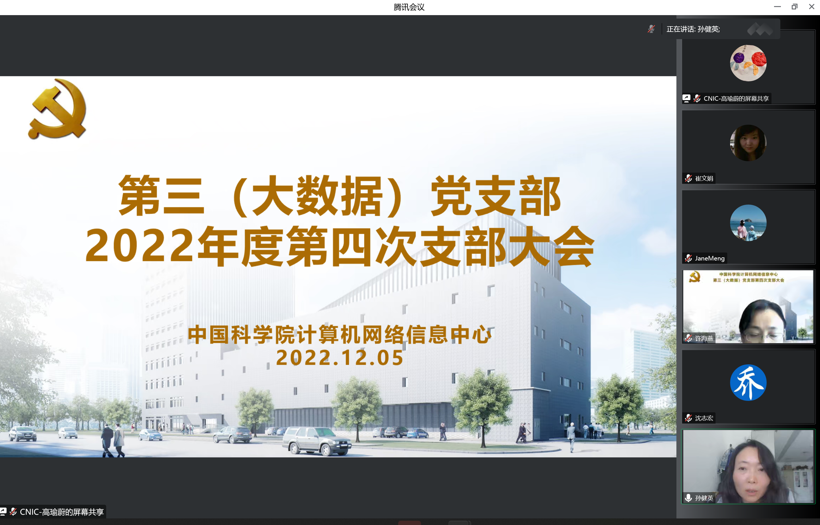 12月5日,第三黨支部召開2022年度第四次支部大會,中心黨委委員、副主任許海燕、黨群辦主任孫健英、支部全體黨員參加會議。受疫情影響,會議以線上形式舉行,大會由黨支部副書記孟珍主持。
