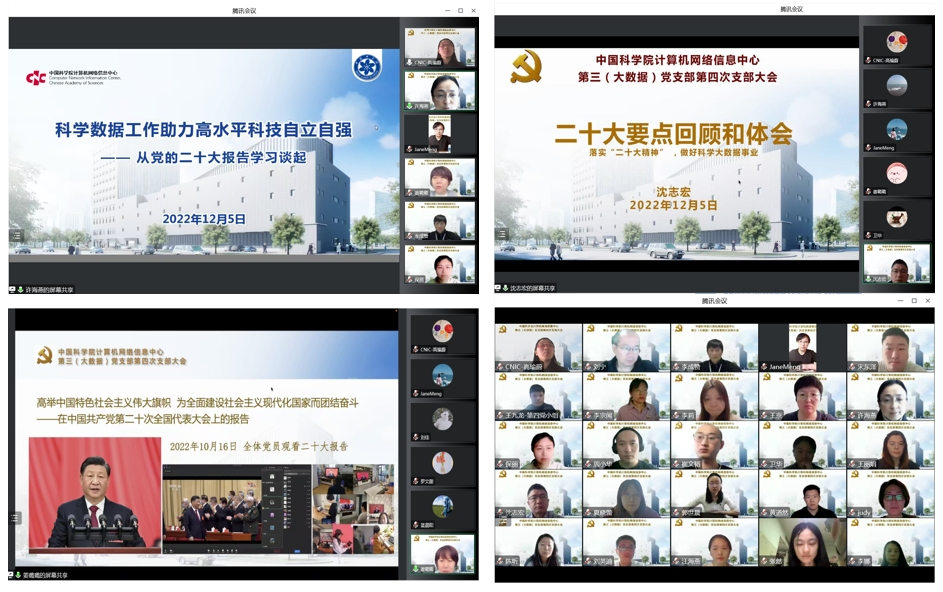 會議最后,中心黨委委員許海燕肯定了支部二十大學(xué)習(xí)成果,要求大家切實領(lǐng)會報告精神內(nèi)核,當(dāng)前科學(xué)數(shù)據(jù)事業(yè)面臨隊伍強、機會好、挑戰(zhàn)大的發(fā)展機遇,應(yīng)當(dāng)把握時機,入腦入心見成效,做出亮眼成績。中心黨群辦主任孫健英肯定了本次大會的重要意義,傳達院黨組和中心黨委關(guān)于學(xué)習(xí)宣傳貫徹黨的二十大精神的工作要求,希望大家將學(xué)習(xí)二十大精神落到實處,統(tǒng)籌推進今年的收官工作和明年的工作謀劃。(撰稿:高瑜蔚)