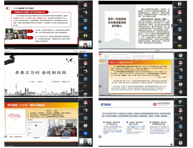 “二十大學(xué)習(xí)月安排”環(huán)節(jié),支部紀(jì)檢委員姜璐璐代表支委會匯報支部二十大學(xué)習(xí)進展和后續(xù)安排。全面回顧和介紹了本月支部在收看二十大會議直播、學(xué)習(xí)各級二十大報告、開展支部知識競賽,以及文化宣傳工作計劃等?!岸髮W(xué)習(xí)談感想體會”環(huán)節(jié),8名員工黨員和學(xué)生黨員代表先后結(jié)合二十大學(xué)習(xí)談自身學(xué)習(xí)體會,分別從老科學(xué)家精神、六個堅持、戰(zhàn)略方向、科教興國、關(guān)鍵技術(shù)研發(fā)、青年工作等角度結(jié)合實際工作分享心得,樹立理想信念。