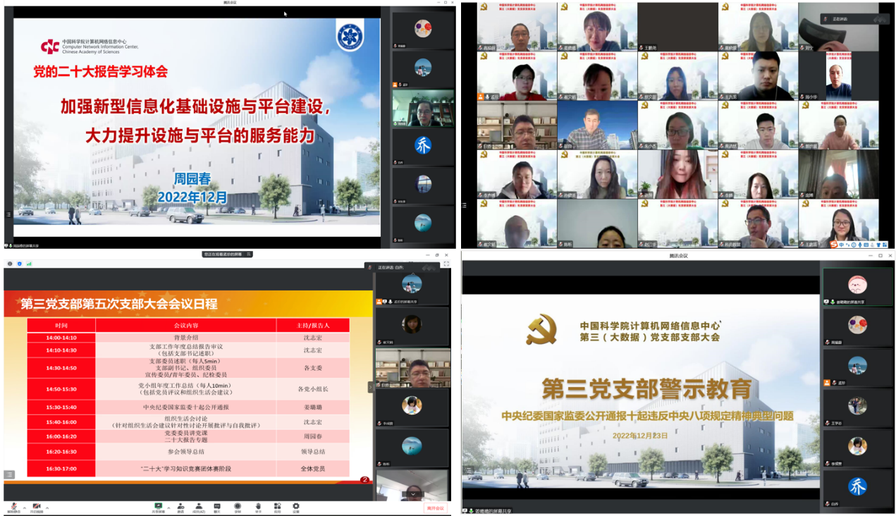 12月23日,第三黨支部召開全體黨員大會暨年度工作總結(jié)會,全體黨員通過在線方式參會,中心黨委委員周園春、黨群辦主任孫健英參會指導。會議由黨支部書記沈志宏主持。
