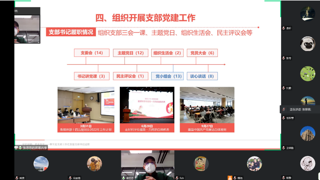 最后一個環(huán)節(jié)是組織生活會和民主評議黨員。支部黨員自由發(fā)言,開展批評與自我批評,為下一步優(yōu)化組織工作提供重要參考。黨員通過線上投票對支委履職情況進行測評、對全體黨員進行民主評議。最終王海波和殷向榮當(dāng)選為優(yōu)秀黨員候選人,張思思當(dāng)選為優(yōu)秀黨務(wù)工作者候選人。