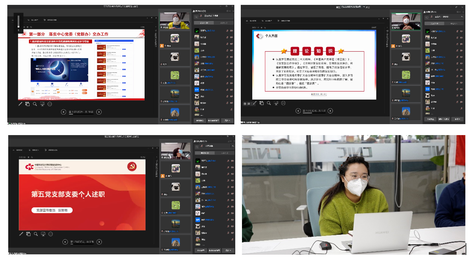 隨后,王閏強做第五黨支部工作匯報暨支部書記述職。以基層組織建設(shè)見成效為主線,講述支部如何守正創(chuàng)新、求真務(wù)實,發(fā)揮戰(zhàn)斗堡壘和先鋒模范作用。支部全年開展黨建活動104次,邀請邱成利、劉俊等專家組織高水平學(xué)習(xí),尤其是創(chuàng)新舉措,開展“創(chuàng)先爭優(yōu)評選”特色活動,通過建立黨員示范崗,激勵黨員進一步發(fā)揮先鋒模范作用。本年度持續(xù)為群眾辦實事,為全院和中心支持學(xué)習(xí)貫徹黨的二十大精神線上專題班、2022年京區(qū)黨員發(fā)展對象培訓(xùn)班等,為打造“學(xué)習(xí)型”黨支部,筑牢堅實戰(zhàn)斗堡壘奠定基礎(chǔ)。接下來,支部副書記趙以霞、組織委員兼統(tǒng)戰(zhàn)委員韓琨、宣傳委員張思思、紀(jì)檢委員兼青年委員趙旭婷分別進行個人年度述職匯報,介紹履職情況、重點工作成效、問題總結(jié)與下一步工作目標(biāo)。