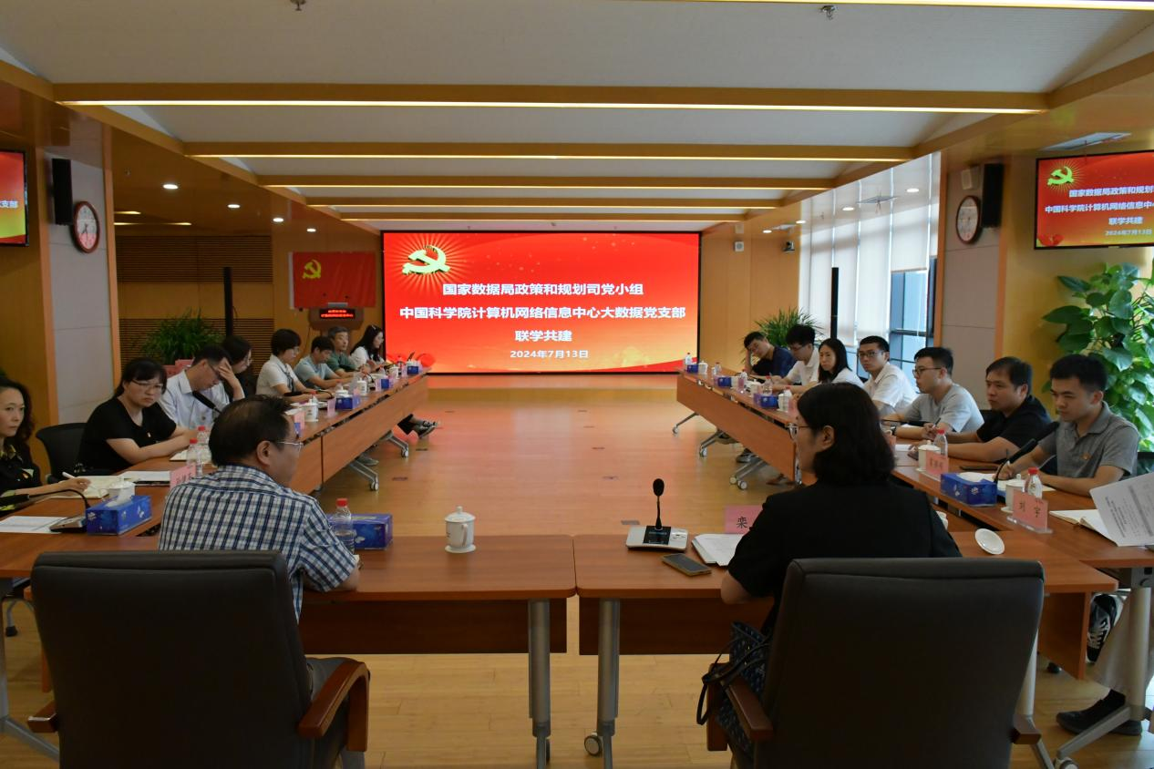 7月13日,第三黨支部與國家數(shù)據(jù)局政策和規(guī)劃司黨小組聯(lián)合開展以“深入學(xué)習(xí)習(xí)近平總書記重要指示精神,以數(shù)據(jù)要素價值釋放支撐科技高水平自立自強”為主題的黨日活動。國家數(shù)據(jù)局政策和規(guī)劃司黨小組組長兼副司長(主持工作)欒婕同志帶領(lǐng)黨小組黨員到訪,中心副主任、黨委委員周園春、黨群辦公室主任孫健英、雙方黨員共30余人參加活動?;顒佑傻谌h支部副書記孟珍主持。