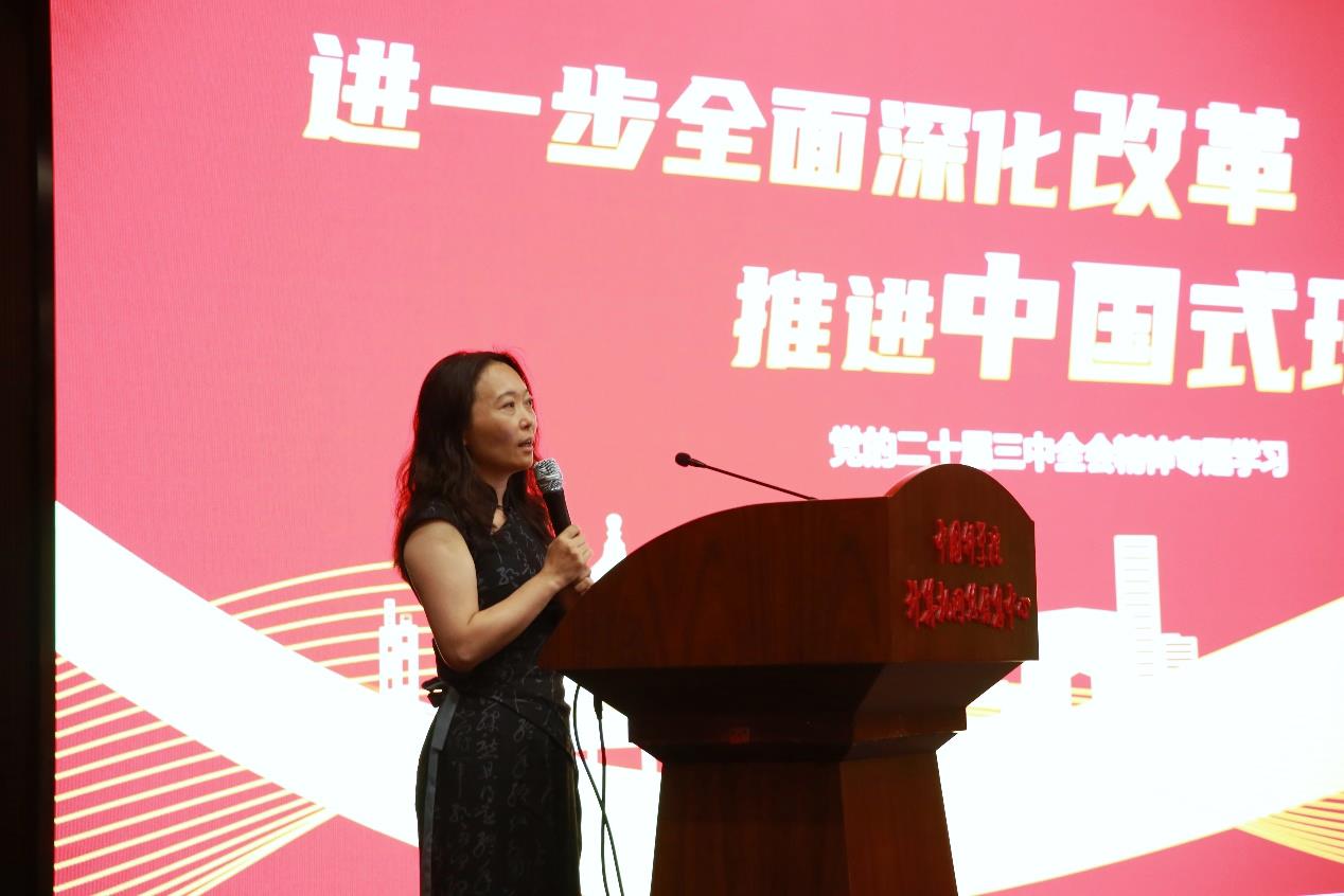 孫健英以“進(jìn)一步全面深化改革,推進(jìn)中國式現(xiàn)代化”為題作專題報(bào)告。報(bào)告介紹了《中國共產(chǎn)黨第二十屆中央委員會(huì)第三次全體會(huì)議公報(bào)》《中共中央關(guān)于進(jìn)一步全面深化改革、推進(jìn)中國式現(xiàn)代化的決定》(以下簡稱《決定》)以及中國科學(xué)院黨組2024年院夏季擴(kuò)大會(huì)議精神。對《決定》中統(tǒng)籌推進(jìn)教育科技人才體制機(jī)制一體化改革、加強(qiáng)黨的領(lǐng)導(dǎo)和深化黨的建設(shè)制度改革等方面的內(nèi)容進(jìn)行了重點(diǎn)解讀。