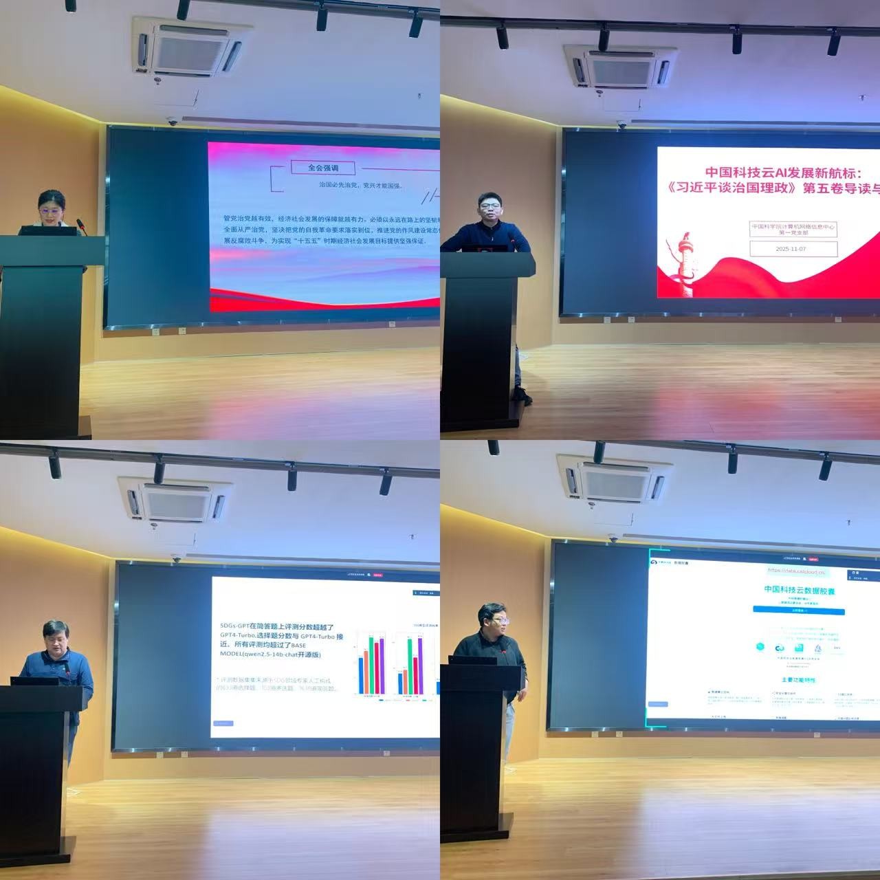 業(yè)務(wù)交流環(huán)節(jié),中心第一黨支部李菁菁同志做“AI時代下的科研信息化技術(shù)演進及實踐”專題報告,探討中心以及第一黨支部AI for Science驅(qū)動下的科研規(guī)劃實施。第一黨支部陳燦、鄭依華等同志詳細介紹了中國科技云在垂域大模型訓(xùn)練、AI應(yīng)用服務(wù)方面的最新工作。