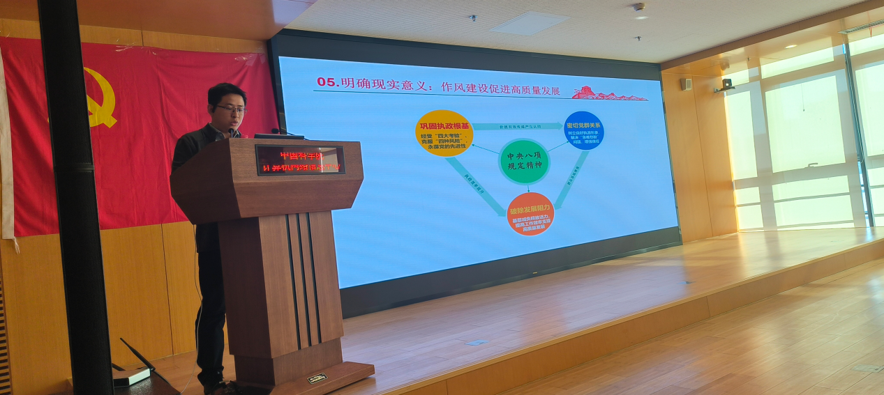 接著,支部書記李彥彪講了一堂“中央八項(xiàng)規(guī)定精神學(xué)習(xí)教育”專題黨課。他回顧了中央八項(xiàng)規(guī)定提出的歷史背景和時代意義,通過提煉精神內(nèi)核和梳理延申規(guī)定闡釋了中央八項(xiàng)規(guī)定與中央八項(xiàng)規(guī)定精神之間的區(qū)別,然后從鞏固執(zhí)政根基、密切黨群關(guān)系、破除發(fā)展阻力三個方面進(jìn)一步介紹中央八項(xiàng)規(guī)定精神的現(xiàn)實(shí)意義和具體實(shí)踐路徑。