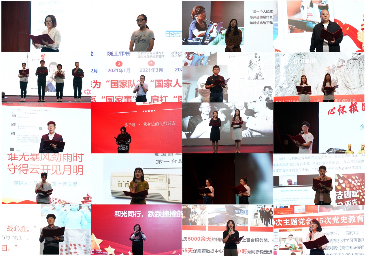 10個黨支部總計20個故事通過現(xiàn)場故事演講,展示我院和我中心黨員先鋒模范風采,弘揚新時代科學(xué)家精神。20個故事,既講述了幾十年默默無聞但為國家做出巨大貢獻的錢三強、郭永懷等老一輩科學(xué)家,在邊疆執(zhí)教的張桂梅,以及革命時期打掉牙送出情報的項與年,還講述了新時代身邊人的故事,有錢華林研究員、陸忠華研究員、黎建輝研究員、研究生喬子越等等,以及ARP團隊、中國科學(xué)院繼續(xù)教育網(wǎng)團隊、企業(yè)團體等感人的故事。20個故事深刻闡述了榜樣就在身邊,偉大出自平凡,平凡造就偉大。