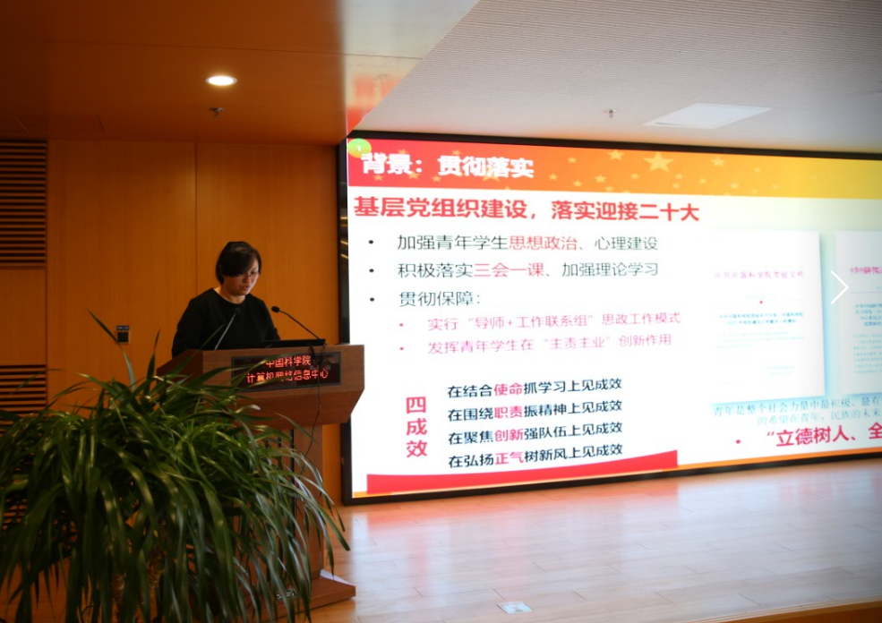 中科院計(jì)算機(jī)網(wǎng)絡(luò)信息中心副主任周園春、黨群辦公室主任孫健英、人教處處長(zhǎng)喬建偉、研究生教育辦公室孫芙寧、各部門負(fù)責(zé)人、各部門兼職輔導(dǎo)員、各黨支部青年委員、團(tuán)委、研究生會(huì)等相關(guān)人員參加會(huì)議。會(huì)議由孫健英主持。