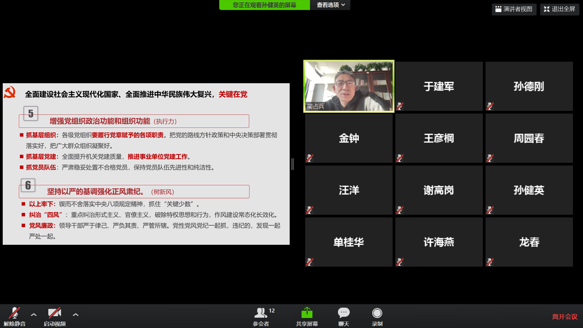會(huì)上,紀(jì)委書(shū)記藺占兵領(lǐng)學(xué)了黨的二十大報(bào)告中的第十五部分《堅(jiān)定不移全面從嚴(yán)治黨深入推進(jìn)新時(shí)代黨的建設(shè)新的偉大工程》和十九屆中紀(jì)委報(bào)告的有關(guān)內(nèi)容。首先介紹了全面從嚴(yán)治黨的總要求,隨后從七個(gè)方面介紹了全面建設(shè)社會(huì)主義現(xiàn)代化國(guó)家、全面推進(jìn)中華民族偉大復(fù)興關(guān)鍵在黨。他指出我們要堅(jiān)持不懈用黨的創(chuàng)新理論凝心鑄魂,保障黨的二十大戰(zhàn)略部署落實(shí)見(jiàn)效;要堅(jiān)定不移推進(jìn)全面從嚴(yán)治黨,推動(dòng)完善黨的自我革命制度規(guī)范體系;要提高一體推進(jìn)不敢腐、不能腐、不想腐能力和水平,堅(jiān)決打贏反腐敗斗爭(zhēng)攻堅(jiān)戰(zhàn)持久戰(zhàn);要堅(jiān)持以嚴(yán)的基調(diào)強(qiáng)化正風(fēng)肅紀(jì),推動(dòng)糾治“四風(fēng)”常態(tài)化長(zhǎng)效化;要牢記打鐵必須自身硬,做對(duì)黨忠誠(chéng)、為國(guó)奉獻(xiàn)、為民造福的衛(wèi)士。