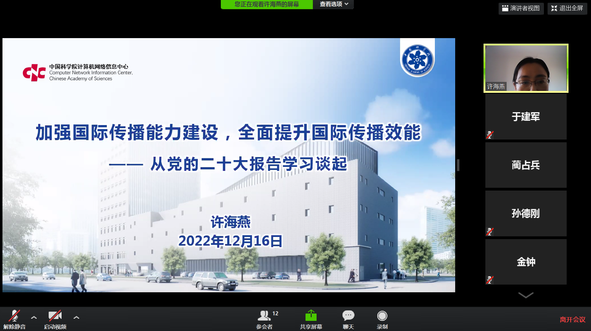 黨委委員、中心副主任許海燕作了題為《加強(qiáng)國(guó)際傳播能力建設(shè),全面提升國(guó)際傳播效能》的報(bào)告。她從黨的二十大報(bào)告學(xué)習(xí)談起,分別從黨中央對(duì)國(guó)際傳播的新要求、中科院對(duì)國(guó)際傳播的新布局、中心對(duì)院國(guó)際傳播的新支撐三個(gè)方面闡述如何立足中心,如何加強(qiáng)國(guó)際傳播能力建設(shè),全面提升國(guó)際傳播效能,并進(jìn)一步增強(qiáng)中華文明傳播力影響力,推進(jìn)文化自信自強(qiáng),鑄就社會(huì)主義文化新輝煌。