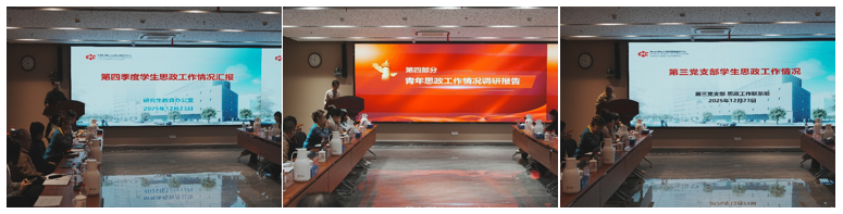 黨群辦公室主任孫健英首先帶領(lǐng)大家共同學(xué)習(xí)了《中國共產(chǎn)黨思想政治工作條例》(以下簡稱《條例》)。她圍繞《條例》的制定目的、重要意義、核心規(guī)定以及后續(xù)落實舉措等方面,進行了系統(tǒng)領(lǐng)學(xué)和深入解讀。人事教育處吳響介紹了第四季度學(xué)生思政工作開展情況;第三黨支部青年委員王華進代表支部匯報了部門2025年度學(xué)生思政工作有關(guān)進展;團委書記姜璐璐圍繞青年思政工作調(diào)研情況匯報了相關(guān)結(jié)果。