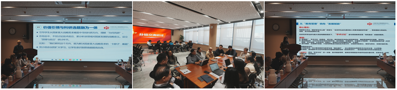 在交流研討環(huán)節(jié),大家結(jié)合會前調(diào)研問卷所反映的難點與建議,重點圍繞兩大主題展開交流:一是“如何讓思政教育從‘軟任務(wù)’變?yōu)榭蒲杏说摹匦拚n’”,二是“如何依托重大項目、團隊建設(shè)等載體,構(gòu)建自然而然融合的育人場景”。