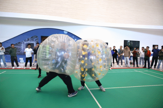 ????在團體趣味項目中,拔河是最受關注的項目,團隊成員需要憑借頑強拼搏、絕不服輸?shù)囊庵?,找準?jié)奏、發(fā)力配合,才能取得勝?!柏斣礉L滾”項目特別考驗團隊的默契,只有步調(diào)一致才能贏得比賽?!芭雠銮颉比の俄椖縿t更加考驗個人對抗實力,通過相互PK的方式進行碰、撞、擠、推、將對手推出比賽場地或者撞到在地上即為獲勝者。