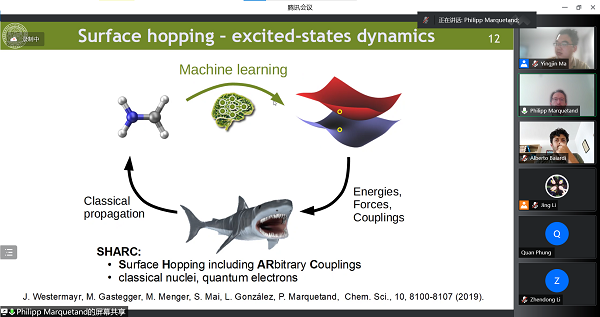 會(huì)中,來自奧地利維也納大學(xué)的Philipp Marquetand教授作了題為“Excited-state machine learning molecular dynamics”的報(bào)告,講述了機(jī)器學(xué)習(xí)輔助的激發(fā)態(tài)分子力學(xué)大規(guī)模計(jì)算模擬的最新研究進(jìn)展;來自南京大學(xué)的馬海波教授以“Stochastic adaptive single-site algorithm and hierarchical mapping for TD-DMRG”為題,介紹了隨機(jī)自適應(yīng)的單格點(diǎn)算法及含時(shí)演化重正化群中的多層映射方法。此外,來自蘇黎世聯(lián)邦理工學(xué)院的Alberto Baiardi博士介紹了基于密度矩陣重正化群的前沿性質(zhì)計(jì)算方案及其高性能計(jì)算實(shí)現(xiàn);來自美國(guó)科羅拉多大學(xué)的Sandeep