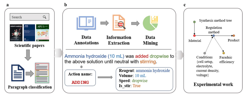 當(dāng)前預(yù)訓(xùn)練大語言模型的蓬勃發(fā)展為面向科學(xué)文獻(xiàn)的領(lǐng)域NLP(Natural Language Processing ,?NLP)任務(wù)帶來了新的前景。我中心大數(shù)據(jù)部與國家納米科學(xué)中心合作,構(gòu)建了大模型增強(qiáng)的電催化還原和合成過程的開源數(shù)據(jù)集,幫助催化領(lǐng)域科學(xué)家快速發(fā)現(xiàn)新型高效催化劑并完成制備,同時發(fā)布了基于電催化領(lǐng)域文獻(xiàn)預(yù)訓(xùn)練和標(biāo)注數(shù)據(jù)指令微調(diào)后的大模型參數(shù),為催化材料領(lǐng)域的其他生成式任務(wù)提供模型支持。該研究成果在Nature數(shù)據(jù)子刊Scientific?Data上發(fā)表。大數(shù)據(jù)部陳雪青、王露笛為論文共同第一作者,杜一研究員為論文共同通訊作者。