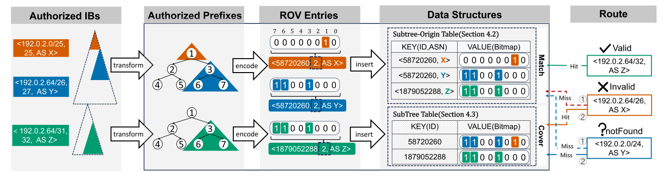 針對BGP路由驗證的性能挑戰(zhàn),前瞻實驗室團隊通過深入建模分析指出現(xiàn)有方案的性能瓶頸源自底層的塊驗證模型,然后提出一種新型的授權(quán)前綴驗證模型從根本上突破性能瓶頸,并基于該模型設(shè)計了一種基于樹比特位圖的高效路由起源驗證算法h2ROV,大幅提升驗證速度并有效降低存儲開銷。算法實驗結(jié)果表明,相比于業(yè)界最優(yōu)算法,h2ROV在IPv4場景下驗證速度提高了1.4倍,內(nèi)存開銷減少了69.9%。系統(tǒng)驗證結(jié)果表明,h2ROV對于路由消息處理流程的影響減少10.4% ~ 61.4%,對于BGP全網(wǎng)收斂時間的影響降低2.2% ~ 16.3%。相關(guān)研究成果被USENIX NSDI 2025錄用。