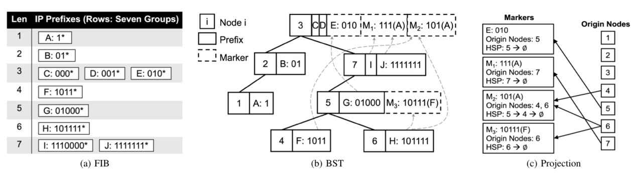 針對IPv6路由查找的性能挑戰(zhàn),前瞻實驗室團隊聯(lián)合華為算法專家通過分析不同網(wǎng)絡(luò)場景下IPv6規(guī)則的分布特點,提出一種基于啟發(fā)式二分搜索的高性能IPv6路由查找的方法HBS,并在此基礎(chǔ)上提出一種樹旋轉(zhuǎn)機制可針對IPv6前綴分布特點動態(tài)調(diào)整樹形,實現(xiàn)不同網(wǎng)絡(luò)場景下的自適應高性能路由查找。實驗效果表明,相比經(jīng)典算法SBS、Tree Bitmap以及最新方法SAIL、Poptrie,HBS的查找性能最高可提升17.5倍、15.5倍、26.6倍和30.2倍。這一研究成果被IEEE/ACM Transactions on Networking錄用。