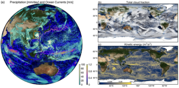 (a)3v2的AP3ESM模擬的大氣降水和海表流速,方框標(biāo)記出來(lái)的是超強(qiáng)臺(tái)風(fēng)“杜蘇芮”;(b)1km的GRIST模擬的總云量;(c)1km的LICOM模擬的海表動(dòng)能。