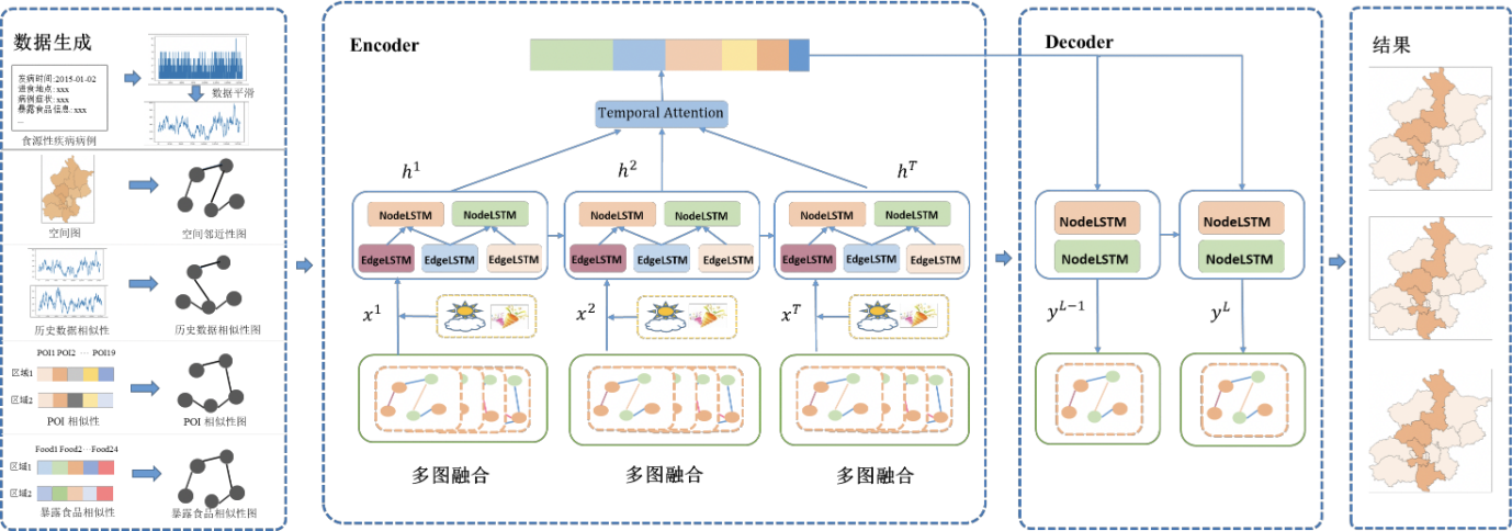 食源性疾病致菌是導(dǎo)致食源性疾病的主要原因,使用數(shù)據(jù)挖掘、機(jī)器學(xué)習(xí)的方法挖掘食源性疾病因素之間潛在的關(guān)聯(lián),從而對(duì)致病菌進(jìn)行識(shí)別,能夠?yàn)槭吃葱约膊〉脑\療起到輔助作用。課題組提出了一種利用機(jī)器學(xué)習(xí)來(lái)識(shí)別食源性疾病致病菌的方法,從空間、時(shí)間、患者信息、暴露食品等方面提取特征,使用合適的機(jī)器學(xué)習(xí)模型來(lái)對(duì)特征進(jìn)行訓(xùn)練和學(xué)習(xí),從而對(duì)重要的食源性疾病致病菌進(jìn)行識(shí)別,以為食源性疾病的診療提供輔助支持。進(jìn)一步,針對(duì)食源性疾病發(fā)病情況的時(shí)空預(yù)測(cè)問(wèn)題,提出了基于多圖結(jié)構(gòu)化 LSTM 的時(shí)空風(fēng)險(xiǎn)預(yù)測(cè)模型,該模型能夠通過(guò)構(gòu)造多種空間相關(guān)性并進(jìn)行動(dòng)態(tài)融合,利用基于 Encoder-Decoder 的結(jié)構(gòu)化 LSTM 模型同時(shí)對(duì)數(shù)據(jù)的時(shí)間依賴性和空間依賴性進(jìn)行建模,實(shí)現(xiàn)對(duì)疾病風(fēng)險(xiǎn)的多步預(yù)測(cè)。