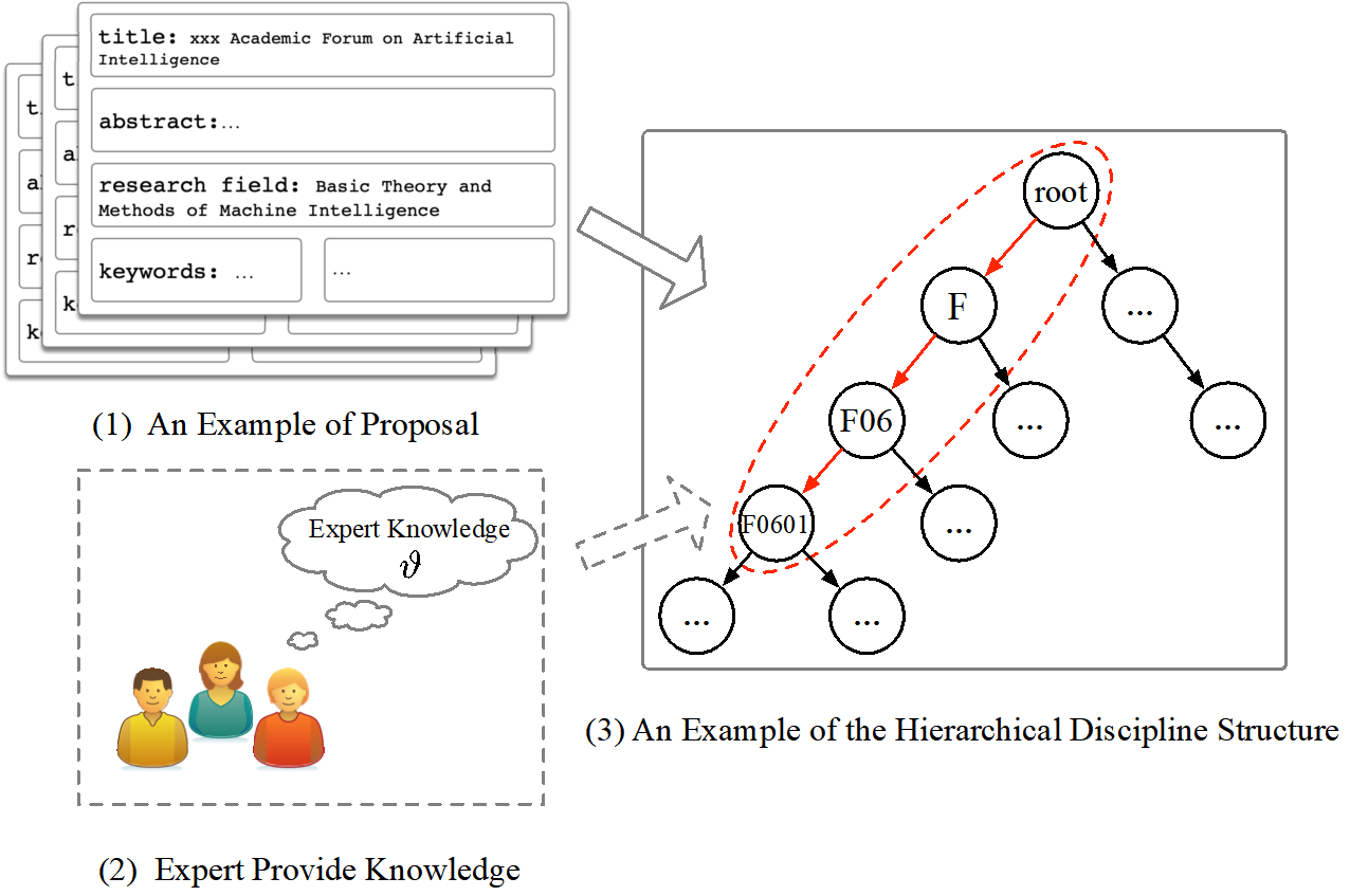 隨著科研項(xiàng)目申請迅速增長,學(xué)科劃分不斷細(xì)化,申請者及科研管理人員如何在具有層次結(jié)構(gòu)的學(xué)科體系中選擇項(xiàng)目申請所屬的細(xì)分學(xué)科領(lǐng)域,是需要解決的重要問題。申請書數(shù)據(jù)是由標(biāo)題、摘要、關(guān)鍵詞、額外屬性、正文等不同類別數(shù)據(jù)組成的復(fù)雜結(jié)構(gòu)文本。并且,在申請書的分類過程中,專家知識可以在較為容易判斷的大類學(xué)科中提供對模型的指導(dǎo),并利用模型生成最為合適粒度的層級標(biāo)簽。
