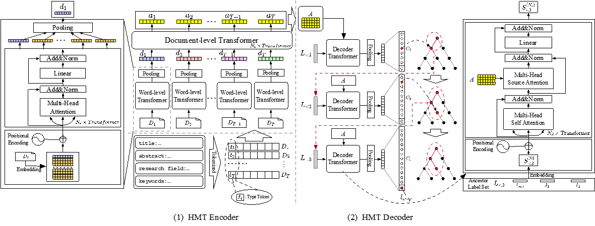 該研究成果提出了一個Encoder-Decoder架構(gòu)的層次多標(biāo)簽分類算法(Hierarchical Multi-label Classification)。編碼器部分,通過利用多層次的Transformer組件實(shí)現(xiàn)對申請書中文本文檔內(nèi)的字詞、文本文檔間的互動關(guān)系進(jìn)行建模,從而完成多類別文本的語義抽取。解碼器部分,利用自注意力機(jī)制抽取專家知識以及已生成標(biāo)簽的特征,并結(jié)合編碼器所抽取的語義信息,依照學(xué)科體系結(jié)構(gòu)逐層生成標(biāo)簽序列。這一研究成果為科研項(xiàng)目分類場景提供了結(jié)合人工智能的解決方案,有著豐富的應(yīng)用場景。(撰稿:肖濛)