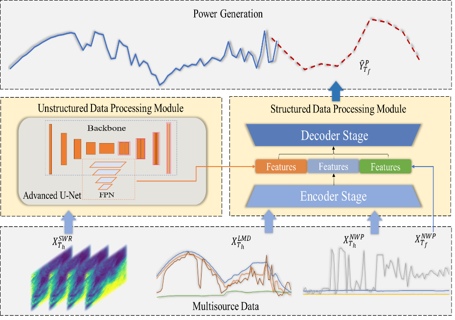 人工智能部提出了一種面向多源異構數據的智能預測框架,在光伏預測領域得到較好的實驗結果。該框架集成了處理非結構化數據的Advanced U-net 模型和處理結構化數據的Encoder-decoder架構?;谏疃葘W習方法,能夠有效提取各種類型數據(如分布式多傳感器實時采集的測量數據、數值天氣預報和衛(wèi)星圖像數據)的空間和時間特征并進行融合,有效提高了短臨輻照度預測精度,進一步提升了光伏發(fā)電預測精度。該技術將有望在國家電網調度進一步落地示范應用。