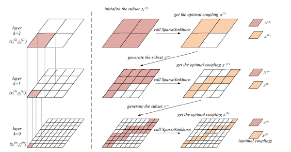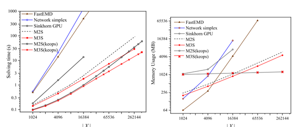 基于此,研究人員提出了一種在稀疏子集上迭代的算法,并提出了一種多尺度的方法來估計(jì)稀疏子集。研究人員證明了算法的收斂性,通過構(gòu)造李雅普諾夫泛函,得到了所提算法收斂速率的上界估計(jì)。研究人員通過采用核函數(shù)截?cái)喾▉碛?jì)算子集,并首次給出了截?cái)嘞禂?shù)的上界,這是迄今理論上所獲最佳結(jié)果。通過在CUDA上實(shí)現(xiàn)并優(yōu)化該算法,使得計(jì)算256*256的圖片之間最優(yōu)傳輸?shù)臅r(shí)間縮短到了3秒以內(nèi),顯存消耗低于3GB;計(jì)算時(shí)間較商業(yè)求解器提升了1000倍以上,內(nèi)存消耗減少了30倍。(撰稿:陳逸東)