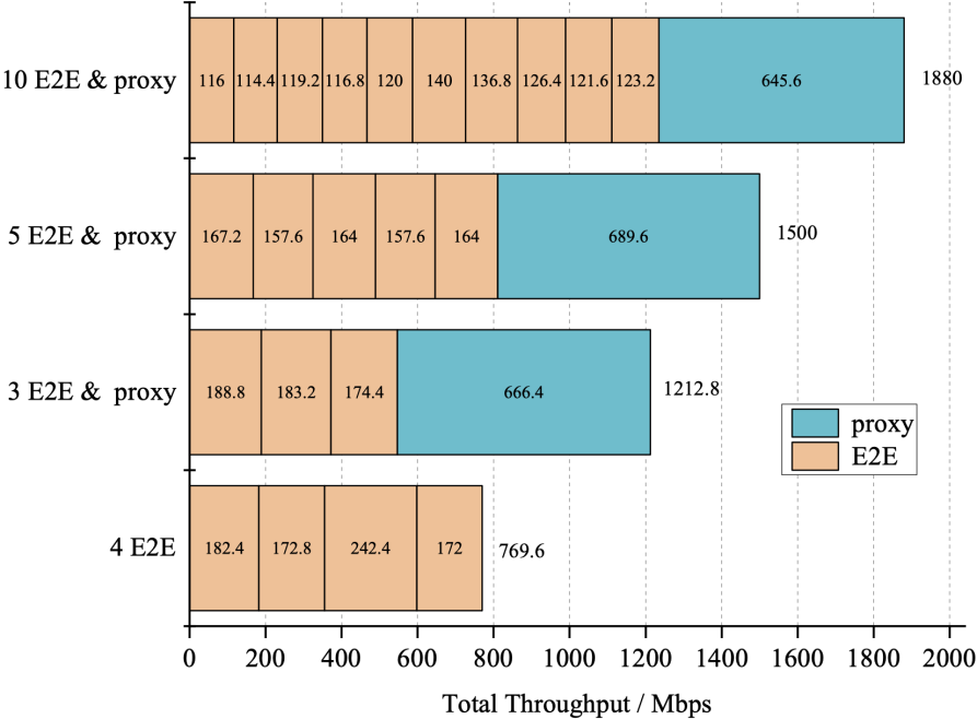 圖3 邊緣側(cè)協(xié)同的代理流與端到端流在并發(fā)傳輸中的性能對(duì)比