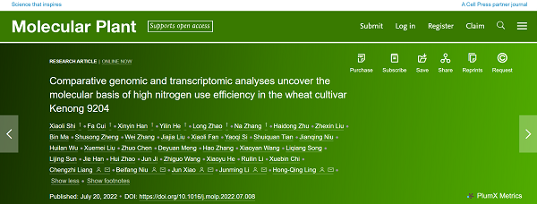 土壤氮素短缺是限制作物生產的最主要因子,從全基因組水平上解析作物氮高效的遺傳及分子機制,培育氮高效作物新品種,提高作物的氮素利用效率,是解決我國及世界農業(yè)的面源污染,實現(xiàn)農業(yè)可持續(xù)發(fā)展和保護環(huán)境的關鍵。近日,高性能計算部、中科院遺傳所植物細胞與染色體工程國家重點實驗室與魯東大學合作,通過基因組測序與生物信息學手段,在解析小麥氮素高效利用的分子機制研究中取得重要進展,相關成果以“Comparative genomic and transcriptomic analyses uncover the molecular basis of high nitrogen use efficiency in the wheat cultivar Kenong 9204”為題于2022年7月22日在線發(fā)表在《Molecular Plant》(圖1)。高性能計算部在讀博士生韓鑫胤為論文的共同第一作者,牛北方研究員為論文的共同通訊作者??萍荚撇坷钶驾佳芯繂T、趙毅高級工程師、業(yè)務發(fā)展處趙蕓卿工程師分別為本研究的高通量基因組數(shù)據(jù)傳輸、高效利用超級計算機“元”計算資源方面提供了技術支持。
