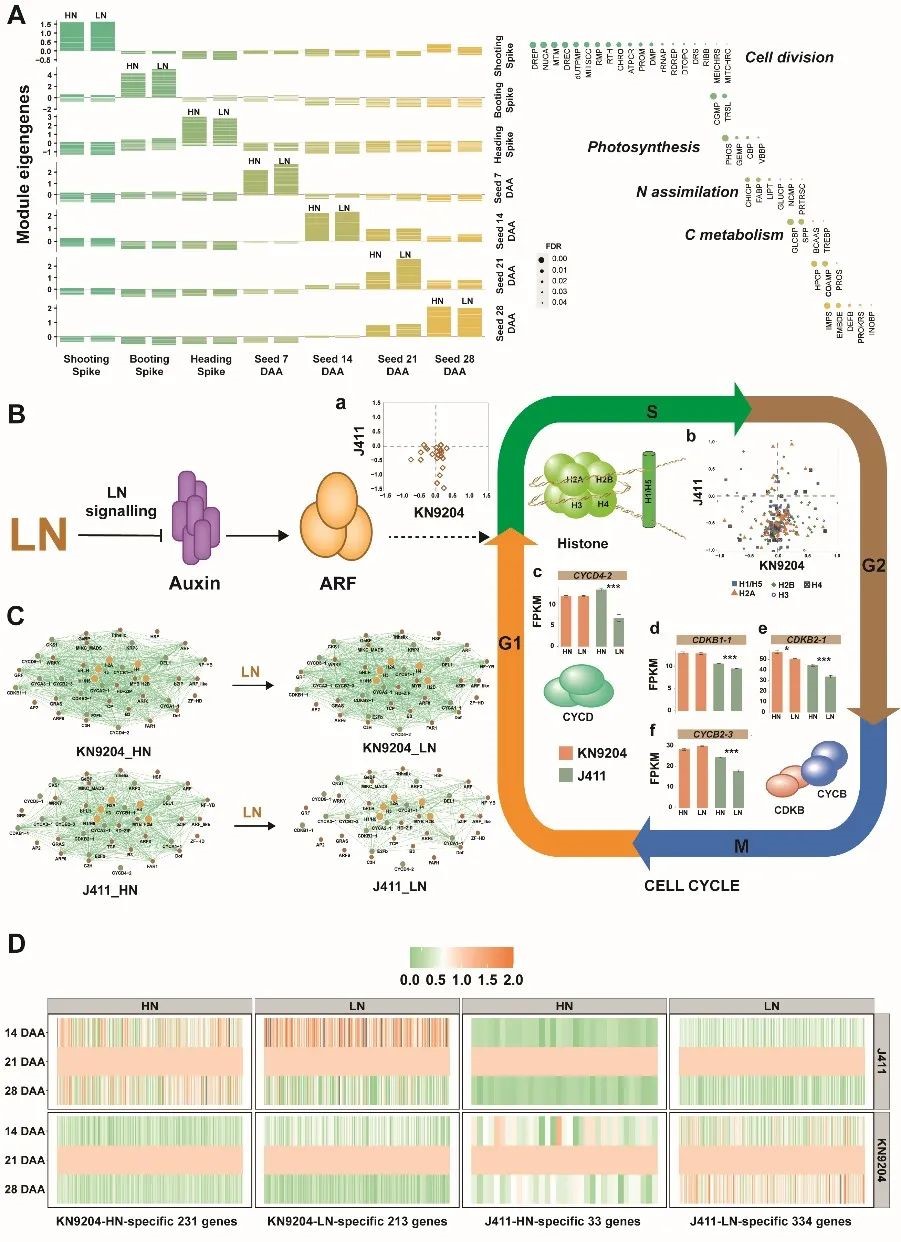 該研究圍繞氮高效小麥品種“科農9204”的大尺度基因組、轉錄組、表觀組及重要基因功能展開計算挖掘,高性能計算部研究團隊基于生物信息學與高性能計算技術,研發(fā)了大尺度基因組并行組裝與注釋的算法和軟件,組裝出了“科農 9204”的高質量基因組序列,并系統(tǒng)地注釋分析了“科農 9204”的氮吸收和代謝相關基因。通過與氮低效品種“京411”的對比研究,鑒定出了小麥響應缺氮的關鍵發(fā)育時期和相關的主要代謝途徑(圖2&圖3),為小麥氮高效的分子機制提供了新觀點,也為培育氮高效的小麥新品種提供了有價值的基因資源。