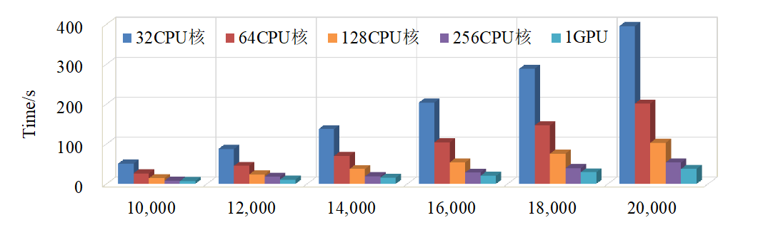 針對(duì)對(duì)稱特征值問(wèn)題高效求解,我中心科研人員研發(fā)了并行算法庫(kù)軟件包HPSPES(High Performance Symmetric Eigenproblem Software)。近期,完成了HPSPES軟件包中稠密特征值問(wèn)題求解的全部關(guān)鍵算法模塊在GPU平臺(tái)的整體移植與深度優(yōu)化。在廣義轉(zhuǎn)標(biāo)準(zhǔn)算法中,采用了將Cholesky 分解和廣義轉(zhuǎn)標(biāo)準(zhǔn)混合求解的并行算法,既降低了通信開(kāi)銷,又實(shí)現(xiàn)了CPU和GPU的協(xié)同工作。三對(duì)角化過(guò)程通過(guò)行條塊和列條塊同時(shí)更新,保證整個(gè)矩陣的完整性,避免了二維通信域下上/下三角矩陣-向量乘帶來(lái)的較大通信開(kāi)銷。另外,引入行-列通信域間轉(zhuǎn)置通信采用塊-塊間完全并行的點(diǎn)-點(diǎn)通信。軟件包的單GPU卡性能與256CPU核心性能相當(dāng),在“東方”超算計(jì)算系統(tǒng)上可擴(kuò)展到全機(jī)。