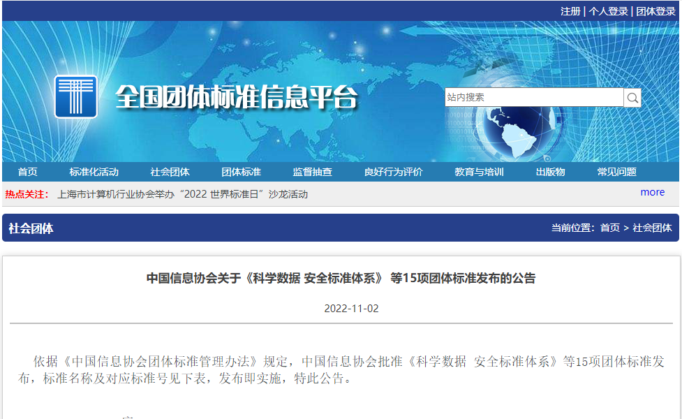 11月2日,依據(jù)《中國信息協(xié)會團體標準管理辦法》規(guī)定,中國信息協(xié)會批準《科學數(shù)據(jù)安全標準體系》等15項團體標準正式發(fā)布,相關(guān)信息發(fā)布在全國團體標準信息平臺(http://www.ttbz.org.cn/Home/WebDetail/46711)。