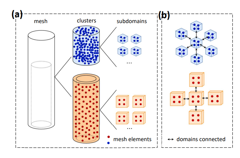 圖1 (a)兩級(jí)分解:一個(gè)底部中空的棒被分成兩個(gè)簇;每個(gè)簇被分成多個(gè)子域 (b)子域及其相關(guān)的連接子域