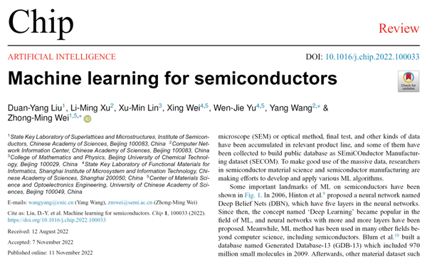 近日,我中心汪洋、研究生徐黎明與半導(dǎo)體研究所魏鐘鳴和劉端陽(yáng)、上海微系統(tǒng)與信息技術(shù)研究所俞文杰和魏星在Chip合作發(fā)表綜述論文。該論文題目為 Machine learning for semiconductors,系統(tǒng)總結(jié)了用于新型半導(dǎo)體材料研發(fā)及制造的機(jī)器學(xué)習(xí)的進(jìn)展,展望了發(fā)展前景。汪洋為該論文合作通訊作者。