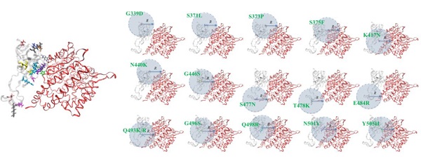 圖2 新冠蛋白重要殘基示意(上),及其同人體蛋白的結(jié)合能力計算(下)