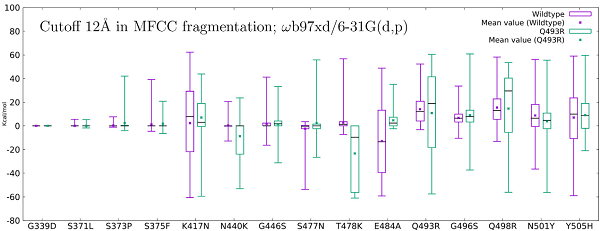 我中心科研人員提出了機器學(xué)習輔助的負載均衡計算方案,并推廣應(yīng)用到一般量子化學(xué)計算中。測試結(jié)果表明,對于上百節(jié)點的計算規(guī)模,該方案比默認的調(diào)度排隊方案提升50%以上的效率(圖1)。結(jié)合該方案,我們在量子化學(xué)層面初步開展了新冠病毒的原始毒株(Wild-type)、奧密克戎變異毒株(Omicron)中重要氨基酸殘基同人類血管緊張素轉(zhuǎn)化酶2(hACE2)相互作用能的計算,以此來分析新冠病毒的原始毒株、變異毒株結(jié)合人體蛋白時的親和能變化(圖2)。