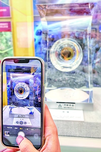 觀眾在中央綜合展區(qū)拍攝月壤樣品。閆匯芳攝/光明圖片
