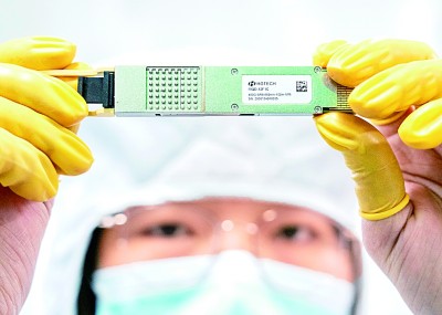 武漢東湖高新區(qū)內(nèi),400G光模塊批量生產(chǎn)。