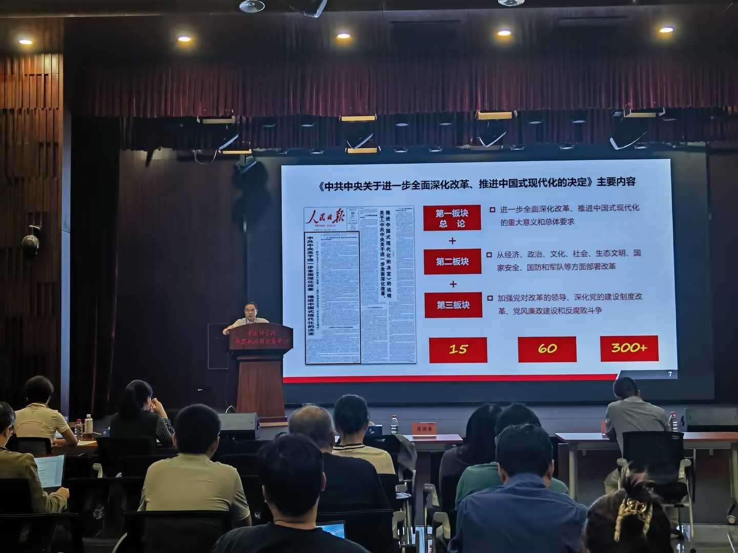 ????周園春以《深入學(xué)習(xí)貫徹黨的二十屆三中全會(huì)精神》為題作領(lǐng)學(xué)報(bào)告,領(lǐng)學(xué)了《中國(guó)共產(chǎn)黨第二十屆中央委員會(huì)第三次全體會(huì)議公報(bào)》《中共中央關(guān)于進(jìn)一步全面深化改革、推進(jìn)中國(guó)式現(xiàn)代化的決定》(以下簡(jiǎn)稱《決定》)以及中國(guó)科學(xué)院黨組2024年院夏季擴(kuò)大會(huì)議精神。